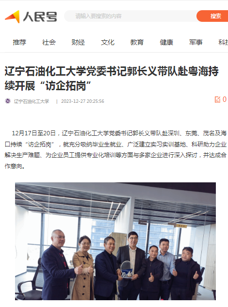 編者按:12月17日至20日,遼寧石油化工大學黨委書記郭長義帶隊赴深圳、東莞、茂名及海口持續“訪企拓崗”,就充分吸納畢業生就業、廣泛建立實習實訓基地、科研助力企業解決生產難題、為企業員工提供專業化培訓等方面與多家企業進行深入探討,并達成合作意向。遼寧日報·遼望號、人民日報客戶端·人民號、中國大學生網等媒體平臺對此進行了宣傳報道。現將相關報道轉載如下: