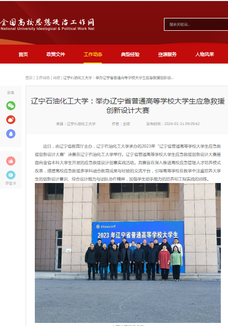 編者按:近日,由遼寧省教育廳主辦,遼寧石油化工大學承辦的2023年“遼寧省普通高等學校大學生應急救援創新設計大賽”決賽在我校舉行。遼寧省普通高等學校大學生應急救援創新設計大賽是面向全省本科大學生開展的應急救援設計創意實踐活動。競賽旨在深入推進高校應急管理人才培養模式改革,搭建高校應急救援多學科融合教育成果與經驗的交流平臺,引導高等學校在教學中注重培養大學生的創新設計意識、綜合設計能力與團隊協作精神,加強學生動手能力的培養和工程實踐的訓練。全國高校思想政治工作網、遼寧日報·遼望號、人民日報客戶端·人民號、中國大學生網等媒體平臺對此進行了宣傳報道。現將相關報道轉載如下: