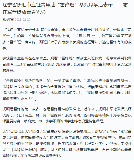 編者按:2月27日,解放軍報、學習強國主平臺對我校坐落于雷鋒生前所在部隊原駐地附近,學子懷揣“走雷鋒成長道路,做雷鋒精神傳人”的愿望,每年都有近300名學生報名應(yīng)征進行了宣傳報道,現(xiàn)將相關(guān)報道轉(zhuǎn)載如下: