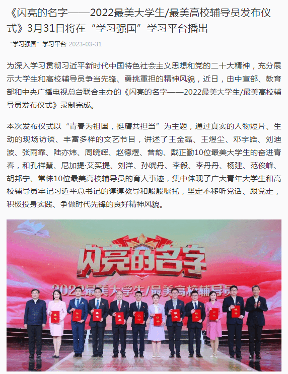 編者按:3月31日,《閃亮的名字——2022最美大學(xué)生/最美高校輔導(dǎo)員發(fā)布儀式》將在“學(xué)習(xí)強(qiáng)國(guó)”學(xué)習(xí)平臺(tái)播出,其中對(duì)我校輔導(dǎo)員孔祥慧進(jìn)行了宣傳報(bào)道,現(xiàn)將相關(guān)報(bào)道轉(zhuǎn)載如下: