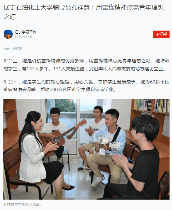編者按:4月6日,學(xué)習(xí)強(qiáng)國(guó)主平臺(tái)以《遼寧石油化工大學(xué)輔導(dǎo)員孔祥慧:用雷鋒精神點(diǎn)亮青年理想之燈》為題,發(fā)文對(duì)我校輔導(dǎo)員孔祥慧的事跡進(jìn)行了宣傳報(bào)道,現(xiàn)將相關(guān)報(bào)道轉(zhuǎn)載如下: