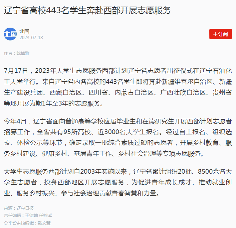 編者按:7月18日,學(xué)習(xí)強(qiáng)國主平臺對2023年大學(xué)生志愿服務(wù)西部計(jì)劃遼寧省志愿者出征儀式在我校舉行進(jìn)行了宣傳報(bào)道,現(xiàn)將相關(guān)報(bào)道轉(zhuǎn)載如下: