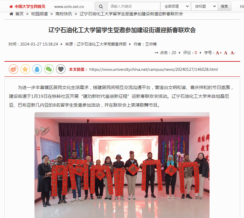 編者按:為進一步豐富轄區居民文化生活需求,搭建居民間相互交流溝通平臺,營造出文明和諧、喜慶祥和的節日氛圍,建設街道于1月19日在鐵嶺社區開展“建功新時代奮進新征程”迎新春聯歡會活動。我校來自坦桑尼亞、巴布亞新幾內亞的8名留學生受邀參加活動,并在聯歡會上表演歌舞節目。中國大學生網、遼寧日報·遼望號、人民日報客戶端·人民號對此進行了宣傳報道。現將相關報道轉載如下: