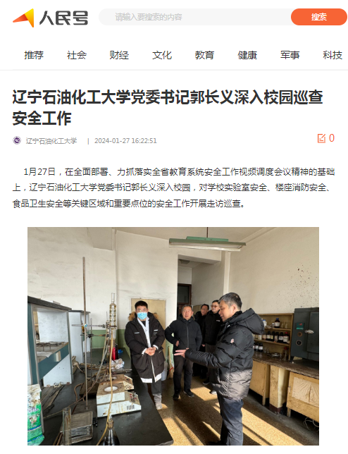 編者按:1月27日,在全面部署、力抓落實全省教育系統安全工作視頻調度會議精神的基礎上,校黨委書記郭長義深入校園,對學校實驗室安全、樓座消防安全、食品衛生安全等關鍵區域和重要點位的安全工作開展走訪巡查。遼寧日報·遼望號、人民日報客戶端·人民號、中國大學生網對此進行了宣傳報道。現將相關報道轉載如下: