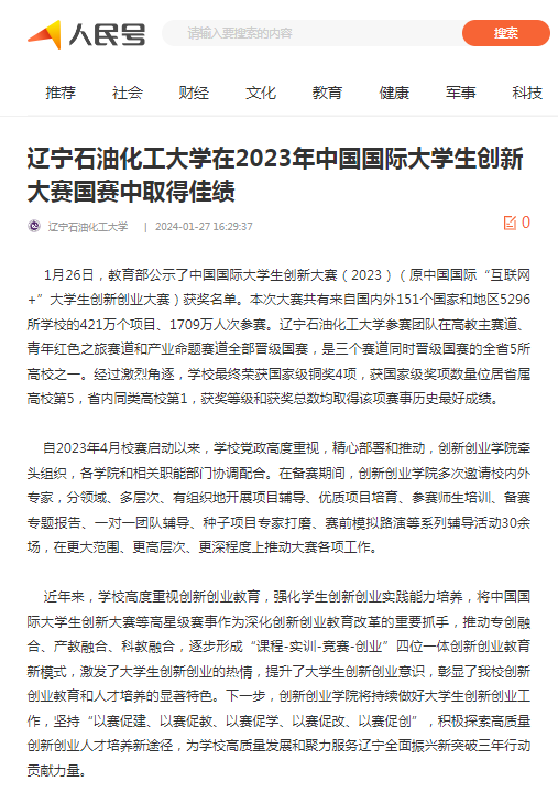 編者按:1月26日,教育部公示了中國國際大學生創新大賽(2023)(原中國國際“互聯網+”大學生創新創業大賽)獲獎名單。本次大賽共有來自國內外151個國家和地區5296所學校的421萬個項目、1709萬人次參賽。我校參賽團隊在高教主賽道、青年紅色之旅賽道和產業命題賽道全部晉級國賽,是三個賽道同時晉級國賽的全省5所高校之一。經過激烈角逐,學校最終榮獲國家級銅獎4項,獲國家級獎項數量位居省屬高校第5,省內同類高校第1,獲獎等級和獲獎總數均取得該項賽事歷史最好成績。遼寧日報·遼望號、人民日報客戶端·人民號、中國大學生網對此進行了宣傳報道。現將相關報道轉載如下: