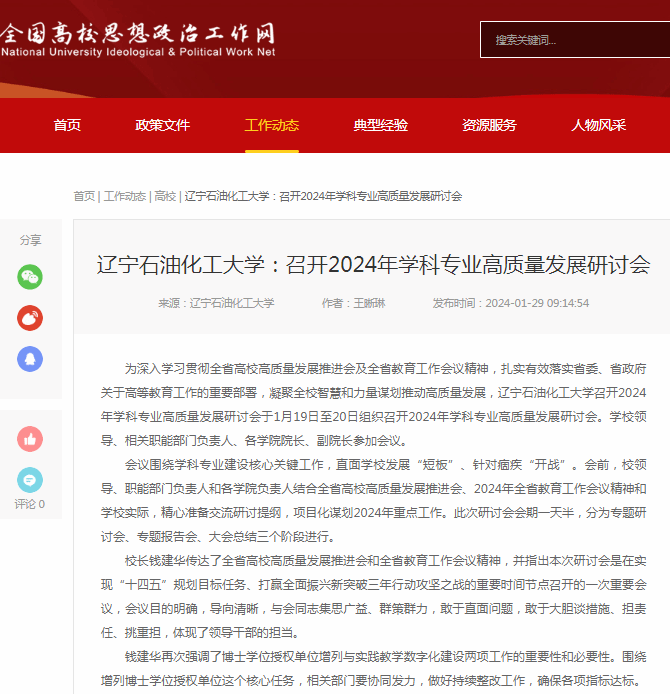 編者按:為深入學習貫徹全省高校高質量發展推進會及全省教育工作會議精神,扎實有效落實省委、省政府關于高等教育工作的重要部署,凝聚全校智慧和力量謀劃推動高質量發展,學校于1月19日至20日組織召開2024年學科專業高質量發展研討會。全國高校思想政治工作網、人民日報客戶端·人民號、中國大學生網對此進行了宣傳報道。現將相關報道轉載如下: