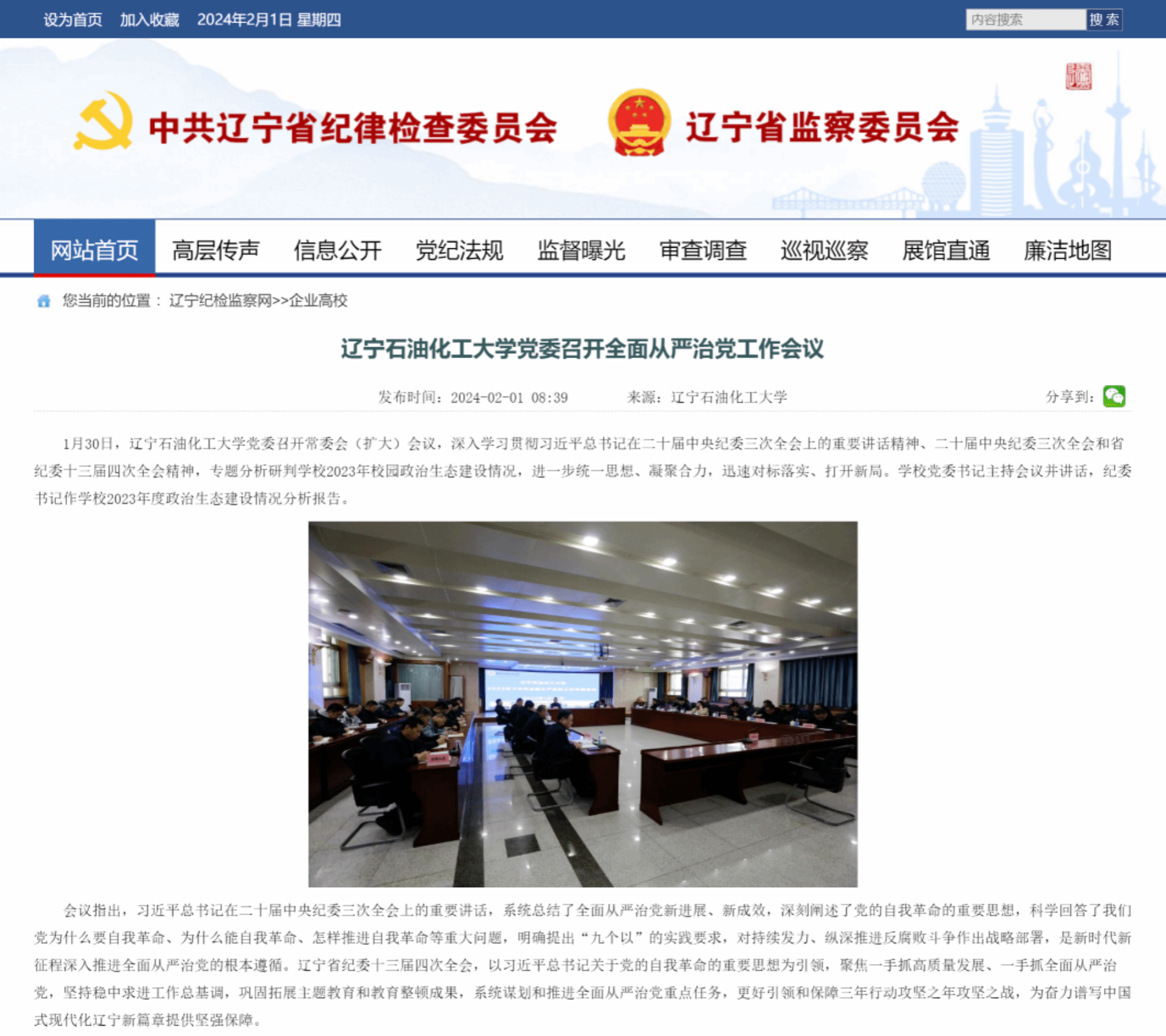 編者按:1月30日,學校黨委召開常委會(擴大)會議,深入學習貫徹習近平總書記在二十屆中央紀委三次全會上的重要講話精神、二十屆中央紀委三次全會和省紀委十三屆四次全會精神,專題分析研判學校2023年校園政治生態建設情況,進一步統一思想、凝聚合力,迅速對標落實、打開新局。遼寧紀檢監察網以《遼寧石油化工大學黨委召開全面從嚴治黨工作會議》為題,對此進行了宣傳報道。現將報道具體內容轉載如下: