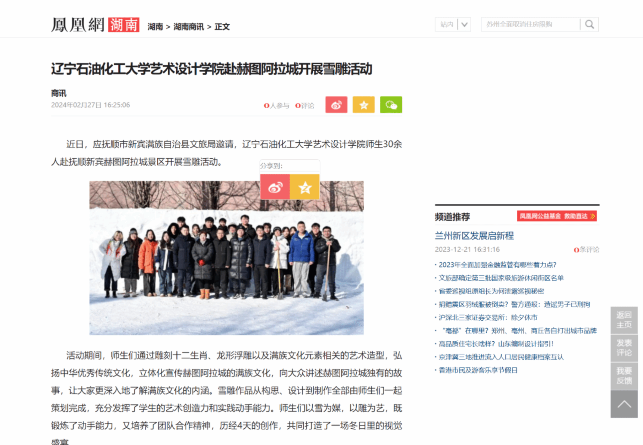 編者按:近日,鳳凰網、人民日報客戶端·人民號、遼寧日報·遼望號、中國大學生網對我校藝術設計學院師生30余人應撫順市新賓滿族自治縣文旅局邀請,赴撫順新賓赫圖阿拉城景區開展雪雕活動進行了宣傳報道。現將相關報道轉載如下:
