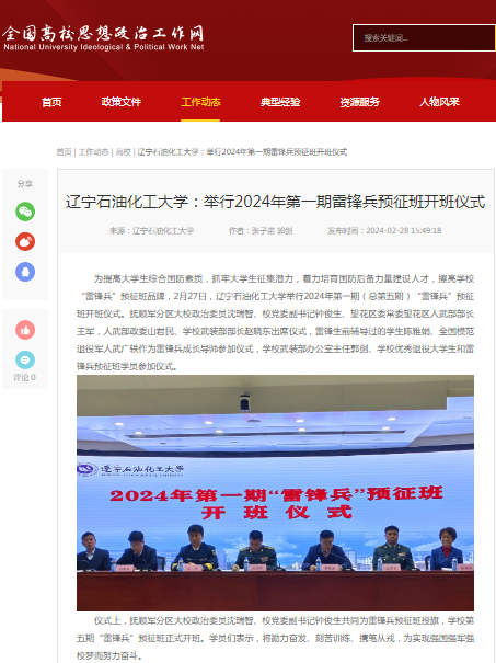 編者按:為提高大學生綜合國防素質,抓牢大學生征集潛力,著力培育國防后備力量建設人才,擦亮學校“雷鋒兵”預征班品牌,2月27日,遼寧石油化工大學舉行2024年第一期(總第五期)“雷鋒兵”預征班開班儀式。全國高校思想政治工作網、學習強國遼寧學習平臺、人民日報客戶端·人民號、遼寧日報·遼望號、中國大學生網對此進行了宣傳報道。現將相關報道轉載如下: