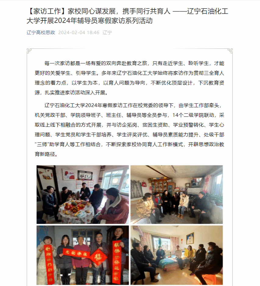 編者按:遼寧高校思政微信公眾號對我校開展家校同心謀發展,攜手同行共育人——2024年輔導員寒假家訪系列活動進行了宣傳報道。現將相關報道轉載如下: