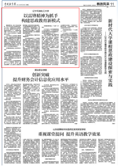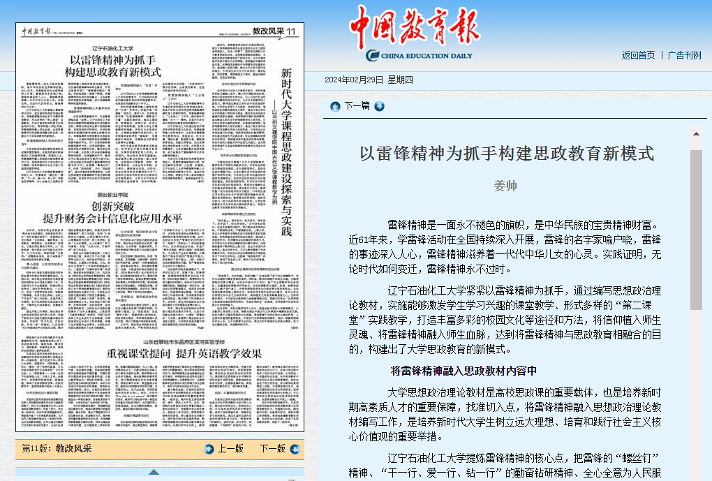 編者按:2月29日,中國教育報第11版教改風采登載了我校石油天然氣工程學院副書記姜帥撰寫的文章《遼寧石油化工大學以雷鋒精神為抓手構建思政教育新模式》。現將相關報道轉載如下: