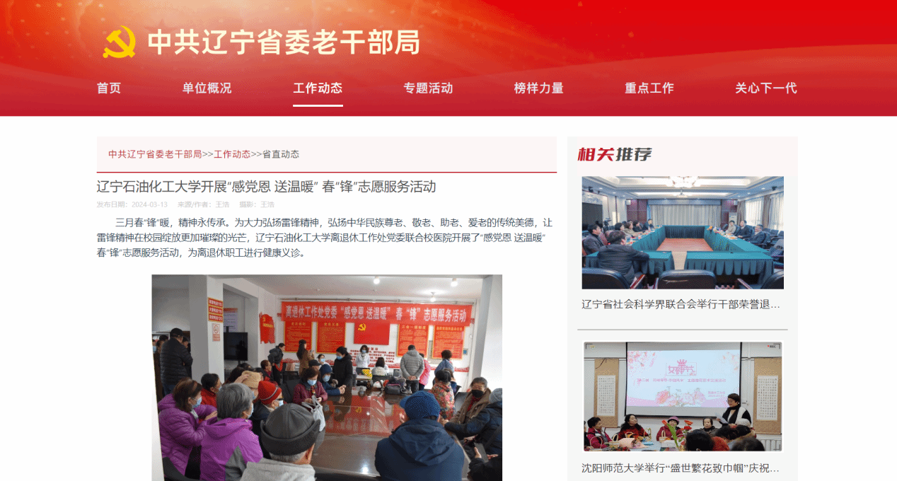 編者按:近日,中共遼寧省委老干部局官網、遼寧日報·遼望號、人民日報客戶端·人民號、中國大學生網登載了我校離退休工作處撰寫的文章《遼寧石油化工大學開展“感黨恩 送溫暖” 春“鋒”志愿服務活動》。現將相關報道轉載如下: