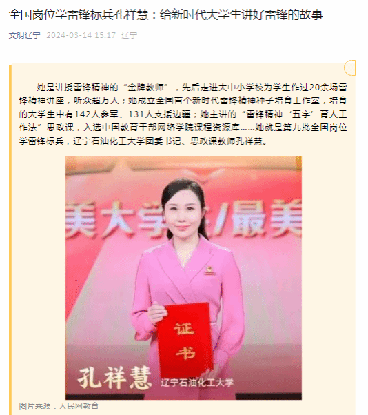 編者按:她是講授雷鋒精神的“金牌教師”,先后走進大中小學校為學生作過20余場雷鋒精神講座,聽眾超萬人;她成立全國首個新時代雷鋒精神種子培育工作室,培育的大學生中有142人參軍、131人支援邊疆;她主講的“雷鋒精神‘五字’育人工作法”思政課,入選中國教育干部網絡學院課程資源庫……她就是第九批全國崗位學雷鋒標兵孔祥慧。近日,人民網、人民日報客戶端遼寧頻道、遼寧日報、遼寧衛視、遼寧省教育廳微信公眾號、文明遼寧微信公眾號等媒體平臺以《孔祥慧:在青少年心中播撒雷鋒精神的種子》為題,對我校團委書記、輔導員教師孔祥慧的先進事跡進行了宣傳報道。現將相關報道轉載如下: