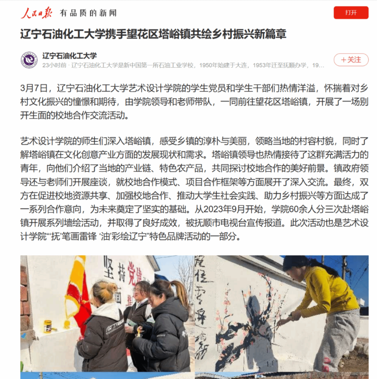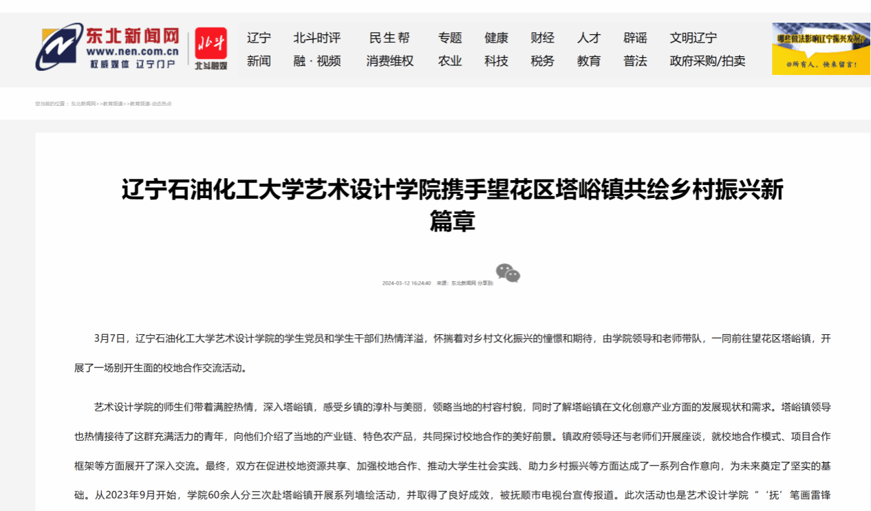 編者按:近日,東北新聞網、人民日報客戶端·人民號、遼寧日報·遼望號對我校藝術設計學院師生赴望花區塔峪鎮,開展校地合作交流活動進行了宣傳報道。現將相關報道轉載如下: