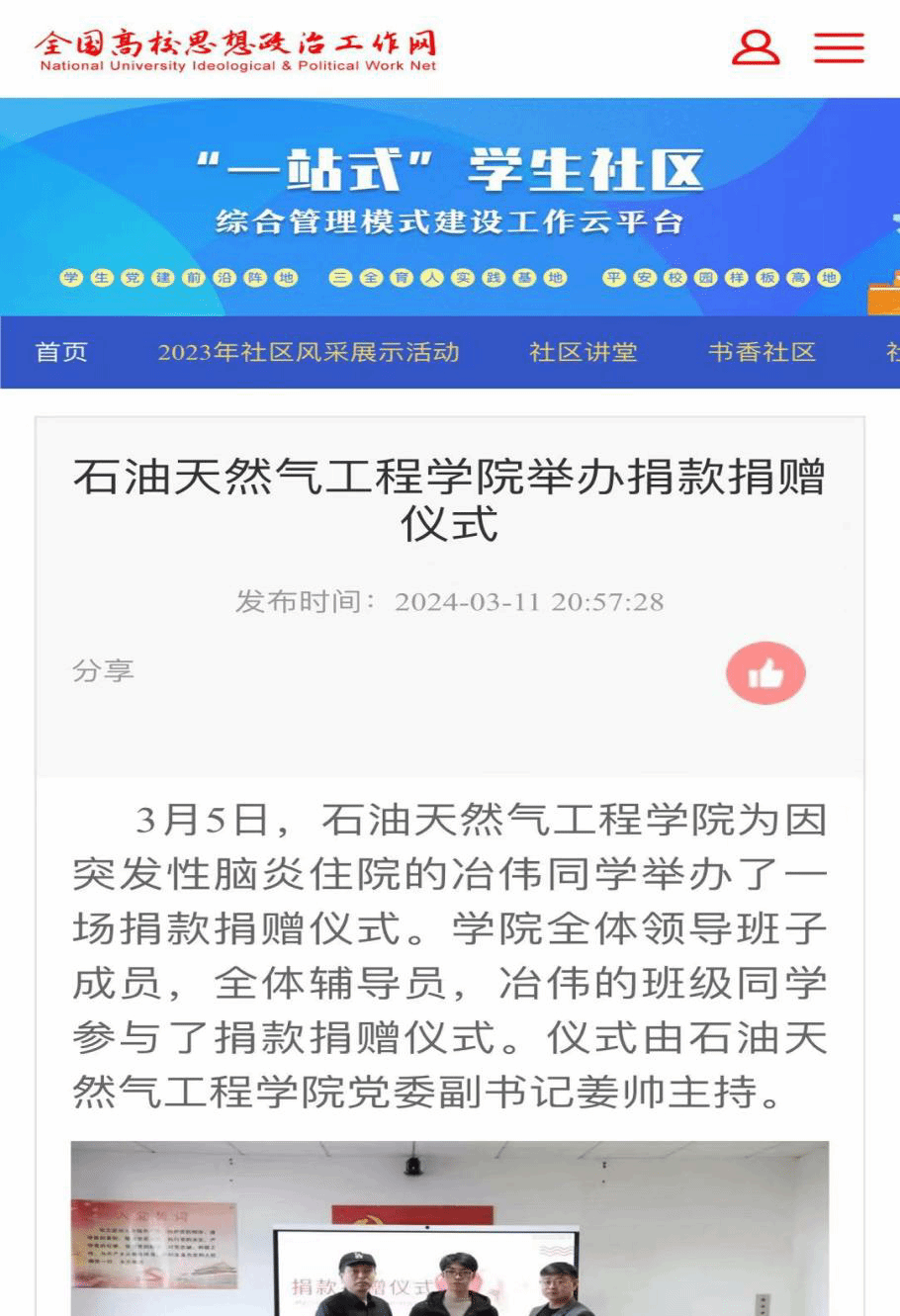 編者按:“病魔無情,人間有愛!”3月5日,石油天然氣工程學院為因突發性腦炎住院的冶偉同學舉辦了一場捐款捐贈儀式。全國高校思想政治工作網對此進行了報道。現將相關報道轉載如下: