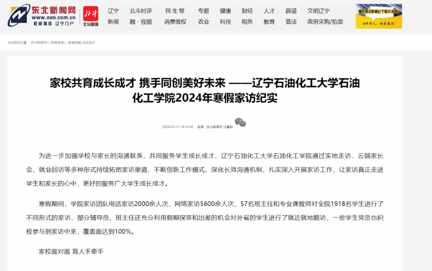 編者按: 3月11日,東北新聞網以《家校共育成長成才 攜手同創美好未來——遼寧石油化工大學石油化工學院2024年寒假家訪紀實》為題,對我校石油化工學院為進一步加強學校與家長的溝通聯系,共同服務學生成長成才,通過實地走訪、云端家長會、就業回訪等多種形式持續拓寬家訪渠道、不斷創新工作模式、深化長效溝通機制,扎實深入開展家訪工作進行了宣傳報道。現將相關報道轉載如下: