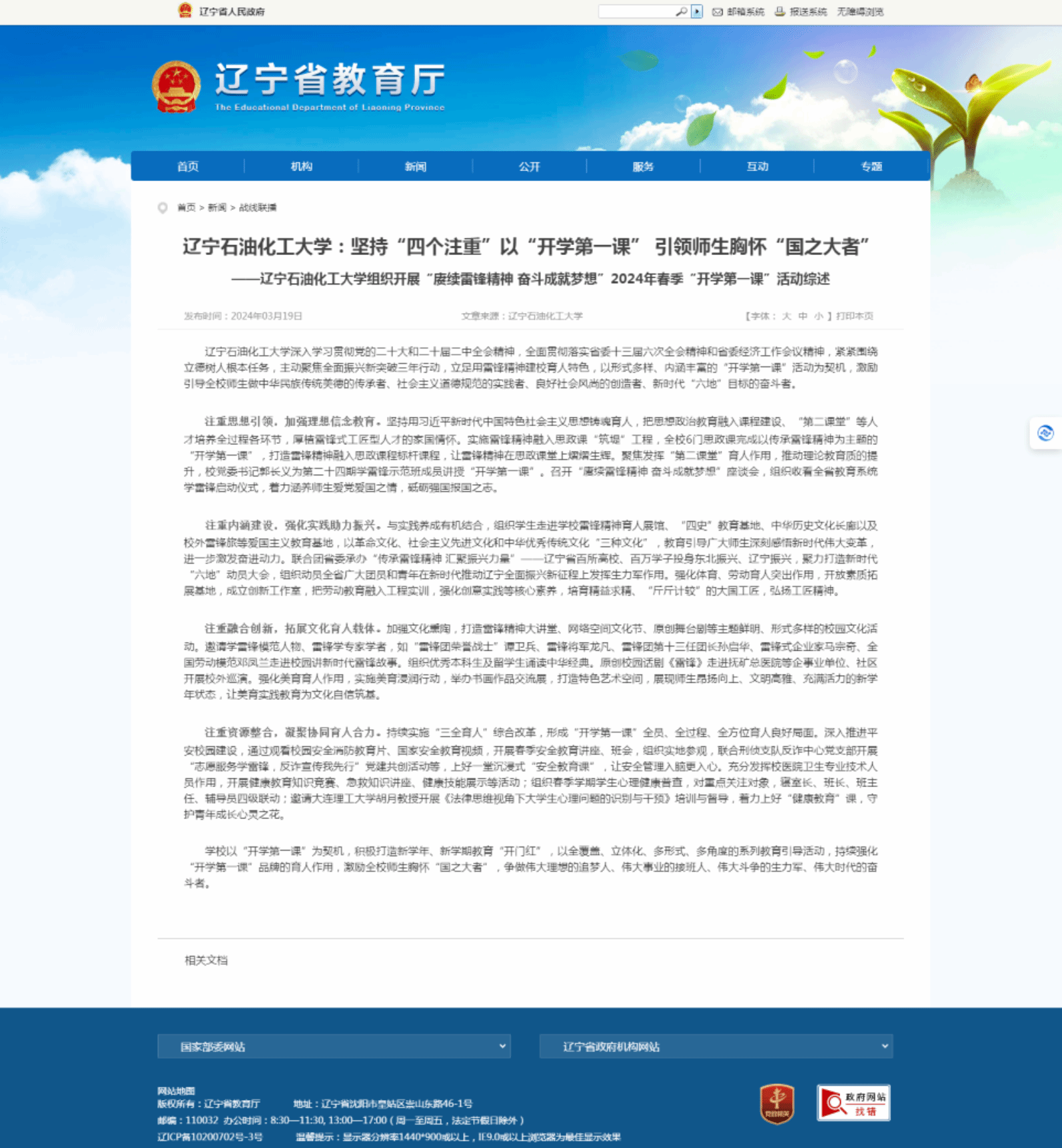 編者按:我校緊緊圍繞立德樹人根本任務,主動聚焦遼寧全面振興新突破三年行動,立足用雷鋒精神建校育人特色,以形式多樣、內涵豐富的“開學第一課”活動為契機,激勵引導全校師生做中華民族傳統美德的傳承者、社會主義道德規范的實踐者、良好社會風尚的創造者、新時代“六地”目標的奮斗者。全國高校思想政治工作網、遼寧省教育廳官網、遼寧日報·遼望號、中國大學生網對此進行了宣傳報道。現將相關報道轉載如下:
