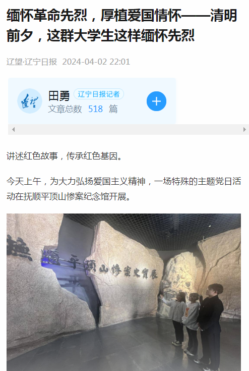 編者按:4月2日,為大力弘揚愛國主義精神,經濟管理學院工程管理專業本科生黨支部與工商管理專業本科生黨支部的28名師生在撫順平頂山慘案紀念館開展一場特殊的主題黨日活動。遼望·遼寧日報對此進行了宣傳報道。現將相關報道轉載如下: