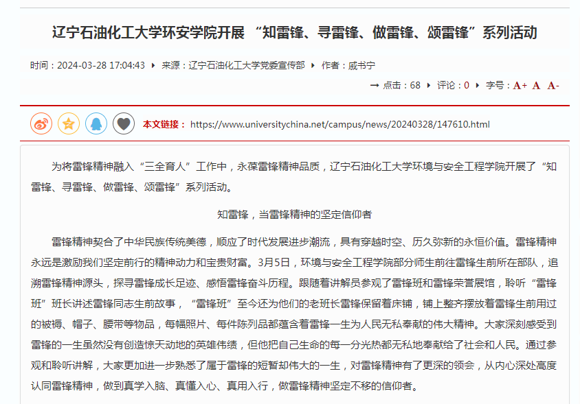 編者按:近日,中國大學生網、人民日報客戶端·人民號、遼寧日報·遼望號對我校環境與安全工程學院組織開展的“知雷鋒、尋雷鋒、做雷鋒、頌雷鋒”系列活動進行報道,現將相關報道轉載如下: