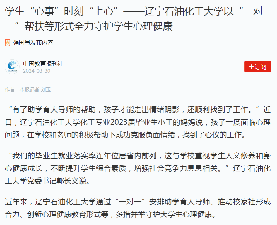 編者按:近日,學習強國主平臺以《遼寧石油化工大學以“一對一”幫扶等形式全力守護學生心理健康》為題,對我校通過“一對一”安排助學育人導師、推動校家社形成合力、創新心理健康教育形式等,多措并舉守護大學生心理健康的做法進行了宣傳報道,現將相關報道轉載如下: