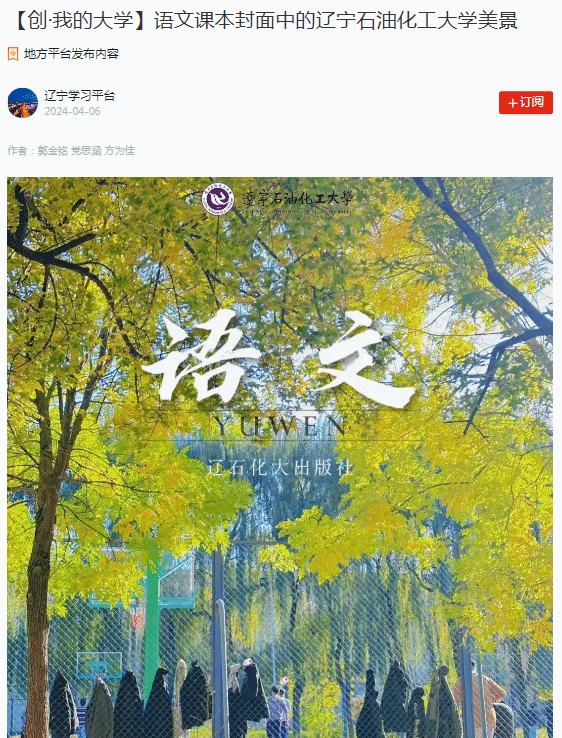編者按:近日,學習強國遼寧學習平臺對我校新媒體中心學生郭金銘、黨思涵、方為佳制作的語文課本封面中的遼寧石油化工大學美景以圖集形式進行了宣傳報道,現將相關報道轉載如下: