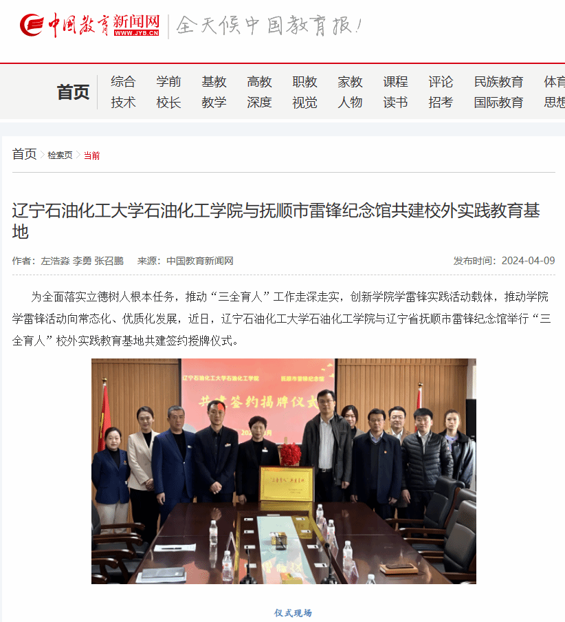 編者按: 4月9日,中國教育新聞網、撫順日報微信公眾號“圈撫順”以《遼寧石油化工大學石油化工學院與撫順市雷鋒紀念館共建校外實踐教育基地》為題,對我校石油化工學院全面落實立德樹人根本任務,推動“三全育人”工作走深走實,創新學院學雷鋒實踐活動載體,推動學院學雷鋒活動向常態化、優質化發展,與遼寧省撫順市雷鋒紀念館舉行“三全育人”校外實踐教育基地共建簽約授牌儀式進行了宣傳報道。現將相關報道轉載如下: