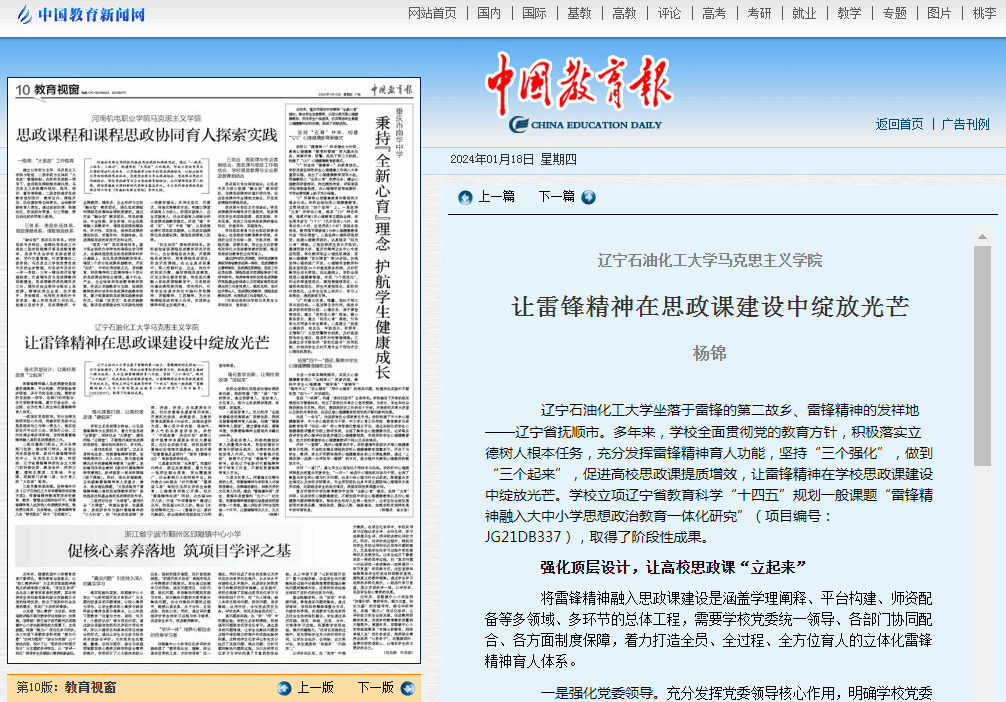 編者按:1月18日,中國教育報第10版以《遼寧石油化工大學馬克思主義學院讓雷鋒精神在思政課建設中綻放光芒》為題,對我校全面貫徹黨的教育方針,積極落實立德樹人根本任務,充分發揮雷鋒精神育人功能,堅持“三個強化”,做到“三個起來”,促進高校思政課提質增效,讓雷鋒精神在學校思政課建設中綻放光芒進行了刊發報道。該文由馬克思主義學院楊錦撰寫。現將相關報道轉載如下: