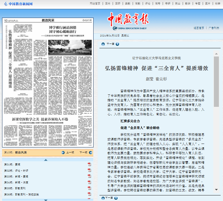 編者按:4月2日,中國教育報第10版以《遼寧石油化工大學馬克思主義學院弘揚雷鋒精神 促進“三全育人”提質增效》為題,對我校始終堅守為黨育人、為國育才的初心和使命,充分發揮雷鋒精神育人功能,將雷鋒精神融入“三全育人”工作體系,促進育人理念入腦、入心、入行,推動育人工作特色化、常態化、長效化進行了刊發報道。該文由趙瑩、崔云杉撰寫。現將相關報道轉載如下: