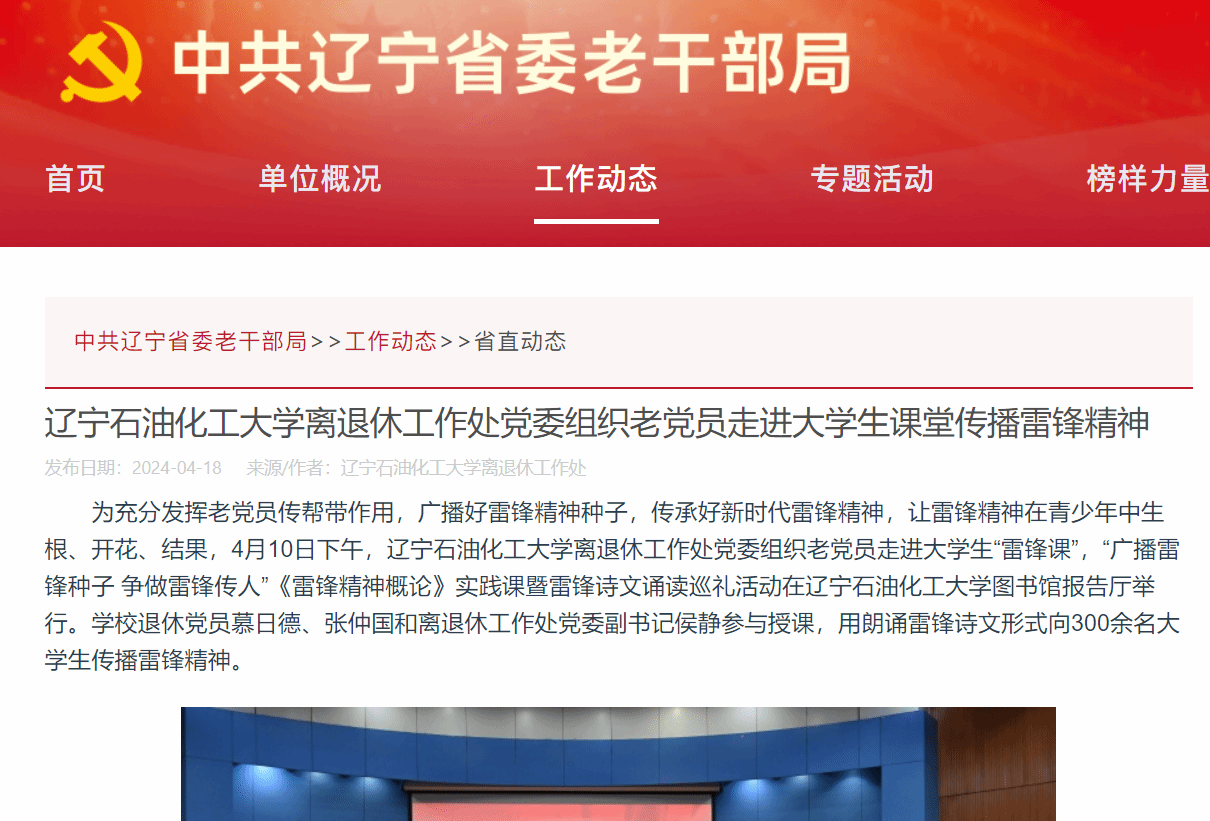 編者按:近日,中共遼寧省委老干部局官網、人民日報客戶端·人民號、遼寧日報·遼望號、中國大學生網登載了我校離退休工作處撰寫的文章《遼寧石油化工大學離退休工作處黨委組織老黨員走進大學生課堂傳播雷鋒精神》。現將相關報道轉載如下: