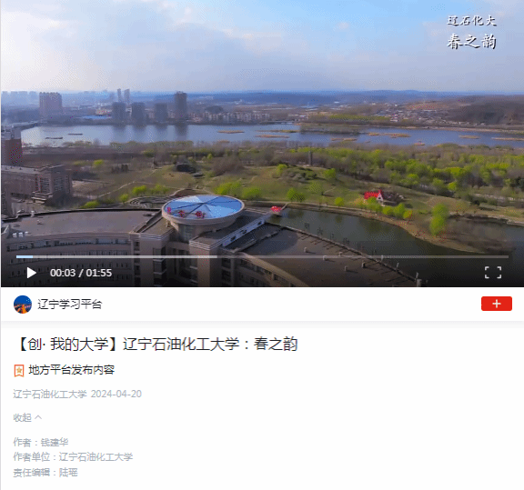 編者按:近日,教育部中國大學生在線、學習強國遼寧學習平臺、人民日報客戶端·人民號、遼寧日報·遼望號等媒體平臺對我校校長錢建華航拍的校園美景視頻《遼寧石油化工大學春之韻》進行了宣傳報道。現將相關報道轉載如下:
