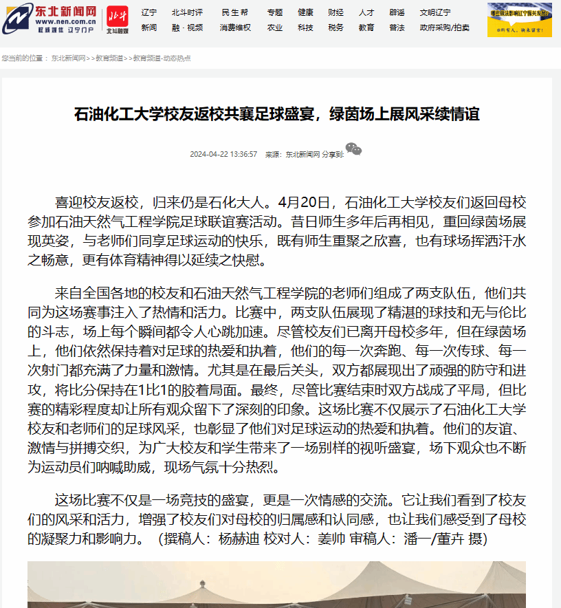 編者按:4月20日,我校校友們返回母校,并參加了石油天然氣工程學院足球聯誼賽活動。昔日師生多年后再相見,重回綠茵場展現英姿,與老師們同享足球運動的快樂,既有師生重聚之欣喜,也有球場揮灑汗水之暢意。東北新聞網對此進行了宣傳報道。現將相關報道轉載如下: