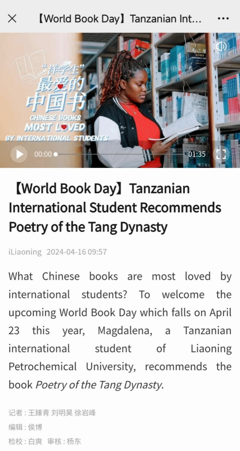 編者按:4月16日,遼寧日報·遼望號以【World Book Day】Tanzanian International Student Recommends Poetry of the Tang Dynasty為題,對我校留學生參加世界讀書日,遼寧省讀書節,洋學生最愛的中國書評選活動,誦讀唐詩《游子吟》進行了宣傳報道。現將相關報道轉載如下: