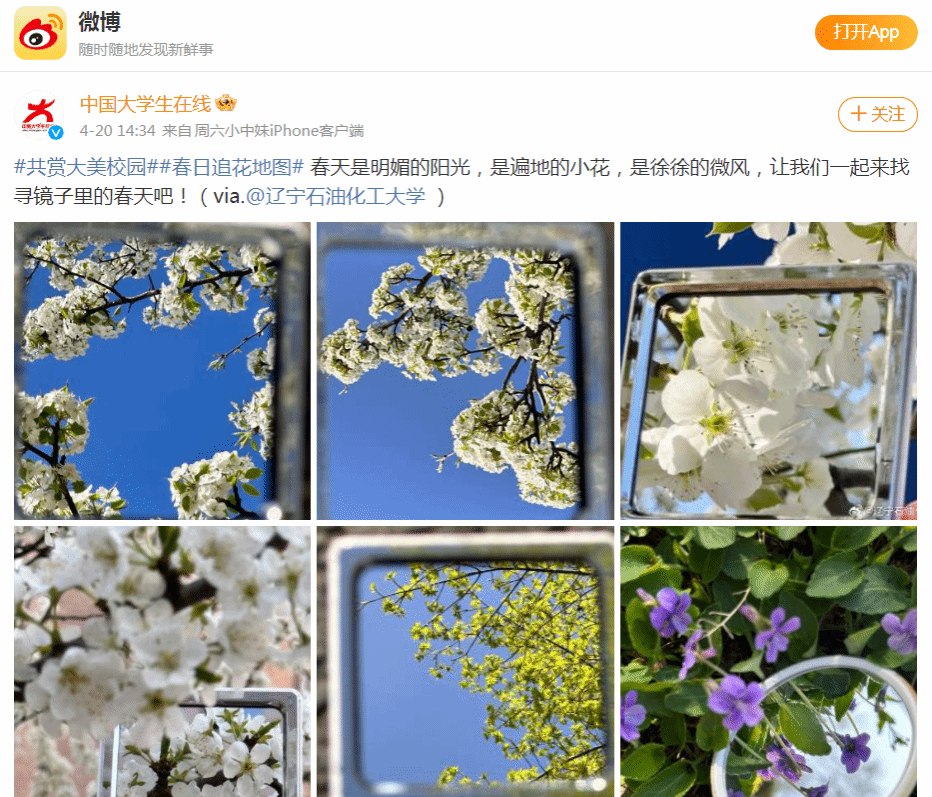 編者按:近日,教育部中國大學生在線官方微博對我校新媒體中心學生拍攝的學校創意春景圖片鏡子里的春天進行了宣傳報道。現將相關報道轉載如下:
