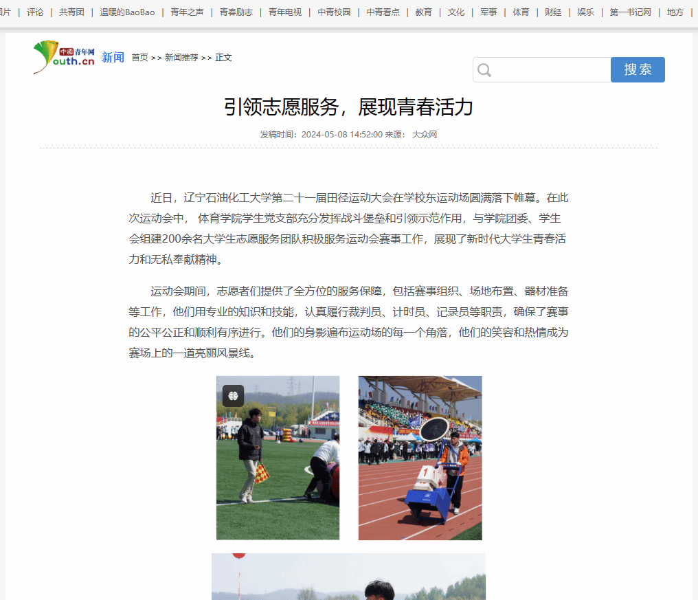 編者按:近日,中國青年網、中國大學生網對我校體育學院學生黨支部充分發揮戰斗堡壘和引領示范作用,與學院團委、學生會組建200余名大學生志愿服務團隊積極服務運動會賽事工作,進行了宣傳報道。現將相關報道轉載如下: