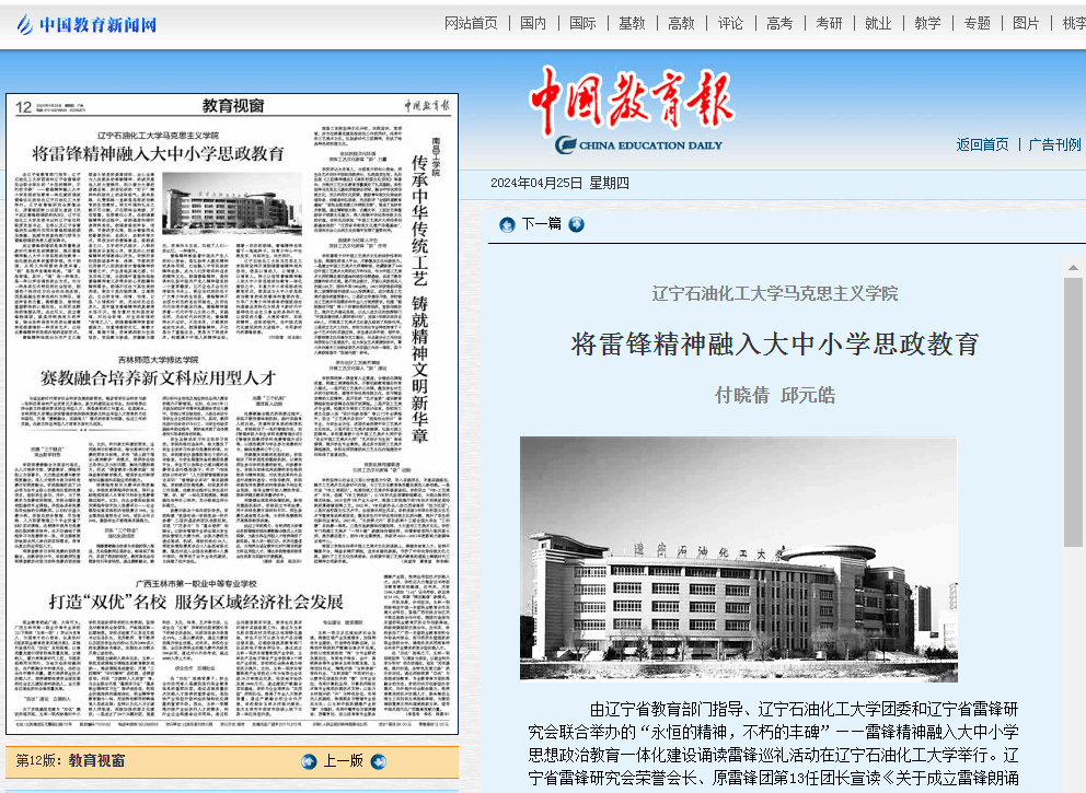 編者按:4月25日,中國教育報第12版以《遼寧石油化工大學馬克思主義學院將雷鋒精神融入大中小學思政教育》為題,對我校開展朗誦雷鋒精神相關活動,使其以情動人、以情感人、以情育人。持之以恒將雷鋒精神融入到大中小學思想政治教育一體化建設之中進行了刊發報道。該文由付曉倩、邱元皓撰寫。現將相關報道轉載如下: