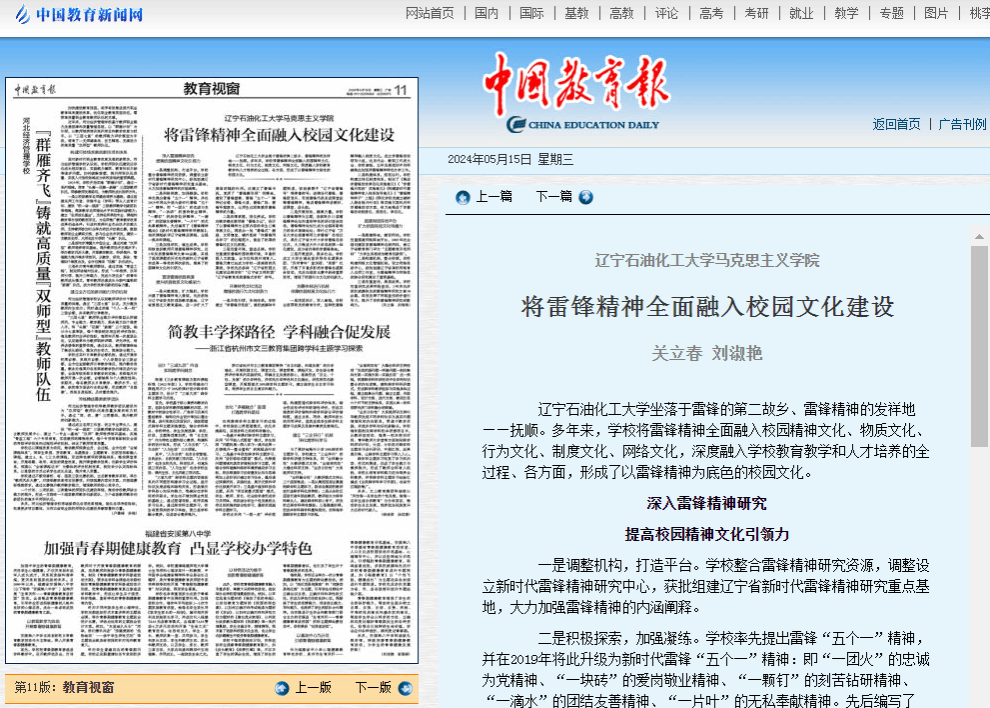 編者按:5月15日,中國教育報第11版以《遼寧石油化工大學馬克思主義學院將雷鋒精神全面融入校園文化建設》為題,對我校將雷鋒精神全面融入校園精神文化、物質文化、行為文化、制度文化、網絡文化,深度融入學校教育教學和人才培養的全過程、各方面,形成了以雷鋒精神為底色的校園文化進行了刊發報道。該文由關立春、劉淑艷撰寫。現將相關報道轉載如下: