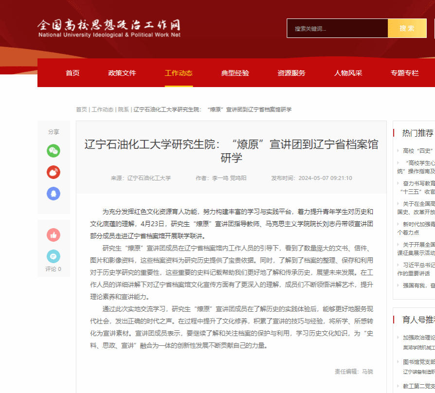 編者按:近日,全國高校思想政治工作網對我校研究生院研究生“燎原”宣講團走進遼寧省檔案館研學進行了宣傳報道。現將相關報道轉載如下: