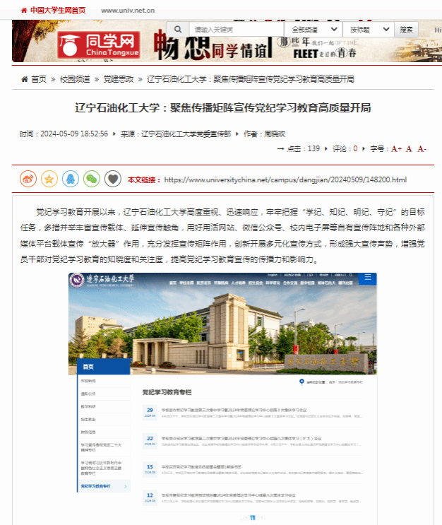 編者按:近日,中國大學生網、遼寧日報·遼望號對我校高度重視、迅速響應,牢牢把握“學紀、知紀、明紀、守紀”的目標任務,多措并舉豐富宣傳載體、延伸宣傳觸角,用好用活網站、微信公眾號、校內電子屏等自有宣傳陣地和各種外部媒體平臺載體宣傳“放大器”作用,充分發揮宣傳矩陣作用,創新開展多元化宣傳方式,形成強大宣傳聲勢,增強黨員干部對黨紀學習教育的知曉度和關注度,提高黨紀學習教育宣傳的傳播力和影響力進行了宣傳報道。現將相關報道轉載如下: