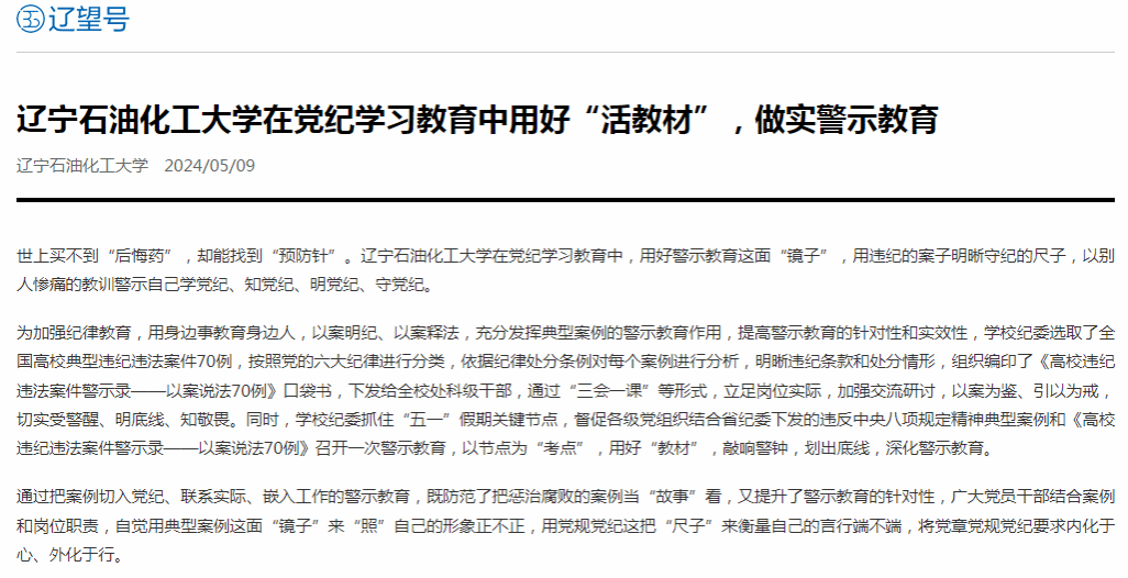 編者按:近日,中國大學生網、遼寧日報·遼望號對我校在黨紀學習教育中,用好警示教育這面“鏡子”,用違紀的案子明晰守紀的尺子,以別人慘痛的教訓警示自己進行了宣傳報道。現將相關報道轉載如下: