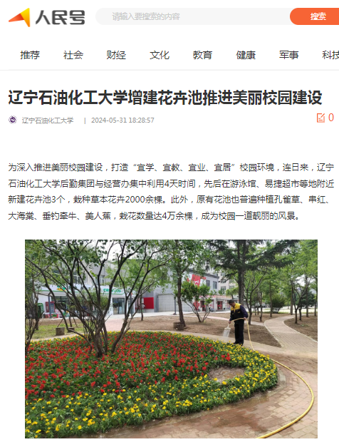 編者按:近日,中國大學生網、人民日報客戶端·人民號、遼寧日報·遼望號、搜狐號對我校為深入推進美麗校園建設,打造“宜學、宜教、宜業、宜居”校園環境,連日來,后勤集團與經營辦集中利用4天時間,先后在游泳館、易捷超市等地附近新建花卉池3個,栽種草本花卉2000余棵進行了宣傳報道。現將相關報道轉載如下: