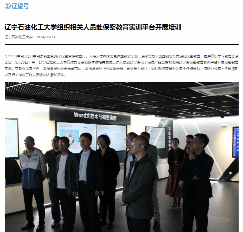 編者按:近日,中國大學生網、人民日報客戶端·人民號、遼寧日報·遼望號、搜狐號對我校為深入貫徹落實總體國家安全觀,深化黨員干部國家安全意識和保密教育,推進黨紀學習教育走深走實,5月20日下午,遼寧石油化工大學黨政辦公室組織學校相關崗位工作人員到遼寧省電子信息產品監督檢驗院遼寧省保密教育實訓平臺開展保密教育實訓進行了宣傳報道。現將相關報道轉載如下: