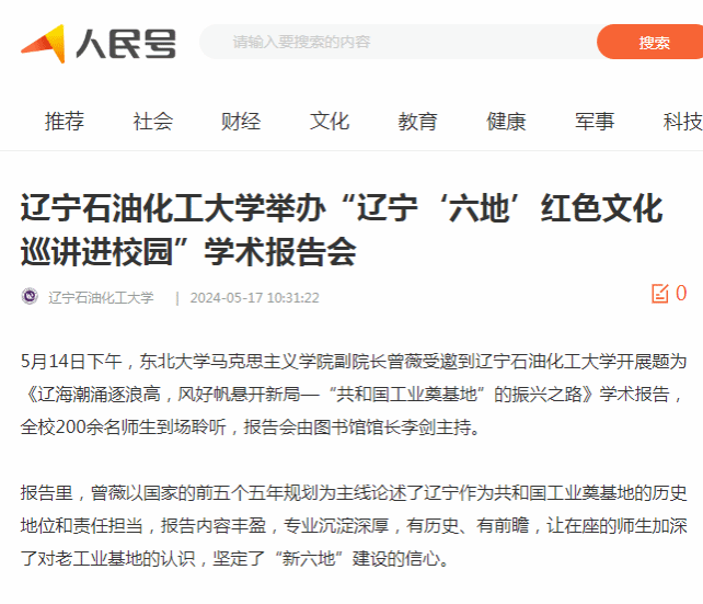 編者按:近日,中國大學生網、人民日報客戶端·人民號、遼寧日報·遼望號對我校圖書館邀請東北大學馬克思主義學院副院長曾薇來校開展題為《遼海潮涌逐浪高,風好帆懸開新局—“共和國工業奠基地”的振興之路》學術報告進行了宣傳報道。現將相關報道轉載如下: