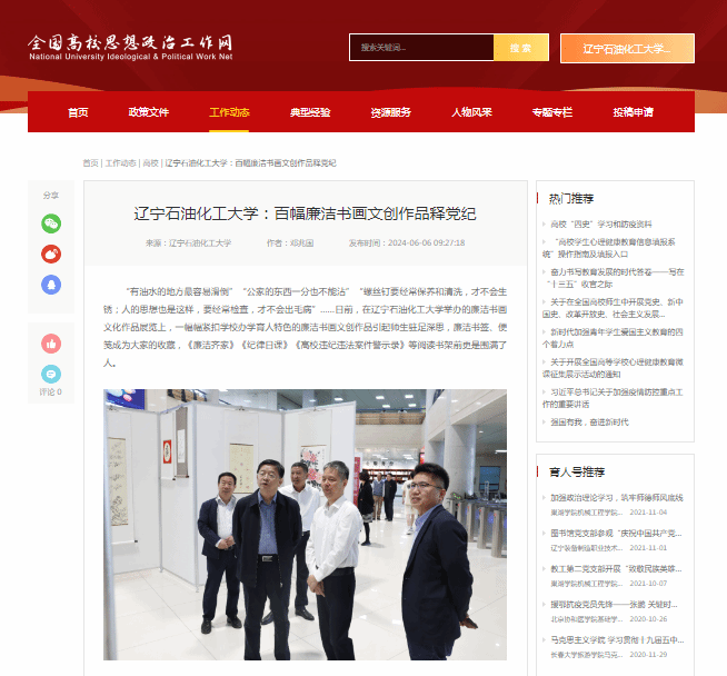 編者按:近日,全國高校思想政治工作網、人民日報客戶端·人民號、遼寧日報·遼望號等媒體平臺對我校在黨紀學習教育過程中,緊扣“新中國第一所石油工業學校”石油化工辦學特色和踐行雷鋒精神、鐵人精神、撫油精神的育人特色,深挖74載辦學歷程積淀的廉潔元素,賡續崇廉尚德文化根脈,鮮亮新時代廉潔擔當精神本色,在學紀知紀明紀守紀中深入學習“三個榜樣”,弘揚“三種精神”,打造“崇廉尚潔、崇實重干、崇德向善”的校園廉潔文化進行了宣傳報道。現將相關報道轉載如下:
