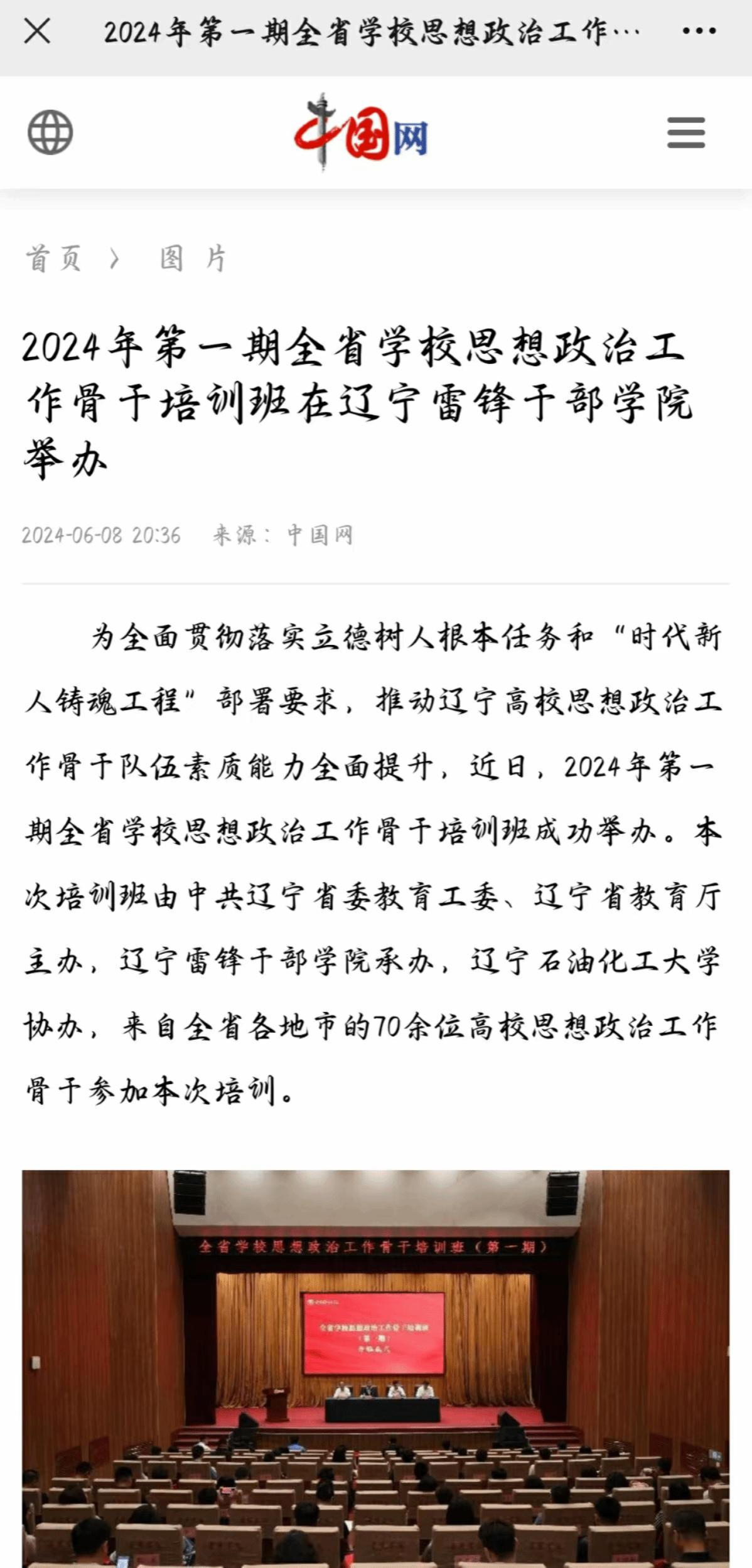 編者按:近日,2024年第一期全省學校思想政治工作骨干培訓班成功舉辦。本次培訓班由中共遼寧省委教育工委、遼寧省教育廳主辦,遼寧雷鋒干部學院承辦,遼寧石油化工大學協辦,來自全省各地市的70余位高校思想政治工作骨干參加本次培訓。中國網、遼寧高校思政、北斗融媒、遼寧日報對其內容進行了宣傳報道。現將相關報道轉載如下: