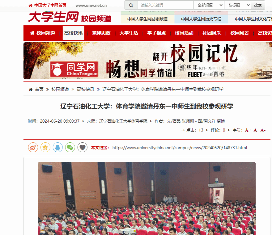 編者按:近日,中國大學生網對我校體育學院邀請丹東一中高二師生近500人到我校參觀研學活動進行了宣傳報道。現將相關報道轉載如下: