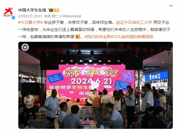 編者按:7月2日,教育部中國大學生在線官方微博對我校為畢業生開展“驕子宴”,用免費餃子送畢業生奔赴新程作了宣傳報道。現將相關報道轉載如下: