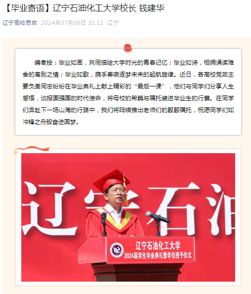 編者按:近日,各高校黨政主要負責同志紛紛在畢業典禮上獻上精彩的“最后一課”,他們與同學們分享人生感悟,談報國強國的時代使命,將母校的希冀與囑托裝進畢業生的行囊。7月6日,遼寧高校思政微信公眾號對我校校長錢建華在2024屆畢業生典禮上的講話,進行了刊載宣傳。現將相關報道轉載如下:
