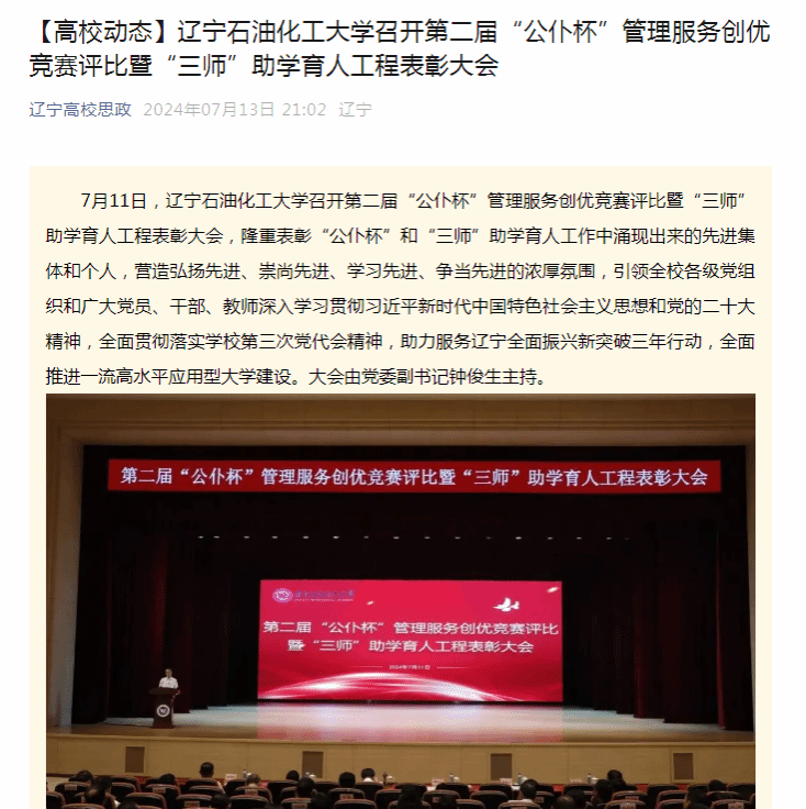 編者按:7月11日,遼寧石油化工大學召開第二屆“公仆杯”管理服務創優競賽評比暨“三師”助學育人工程表彰大會,隆重表彰“公仆杯”和“三師”助學育人工作中涌現出來的先進集體和個人,營造弘揚先進、崇尚先進、學習先進、爭當先進的濃厚氛圍。遼寧高校思政微信公眾號、人民日報客戶端·人民號、遼寧日報·遼望號等媒體平臺對其進行了宣傳報道。現將相關報道轉載如下: