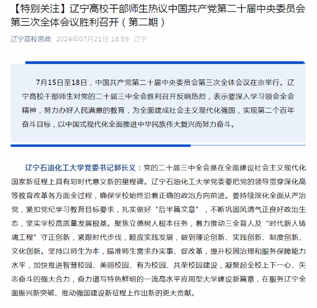 編者按:7月15日至18日,中國共產黨第二十屆中央委員會第三次全體會議在京舉行。遼寧高校干部師生對黨的二十屆三中全會勝利召開反響熱烈。7月21日,遼寧高校思政微信公眾號對我校黨委書記郭長義的熱議進行了組稿宣傳。現將相關報道轉載如下: