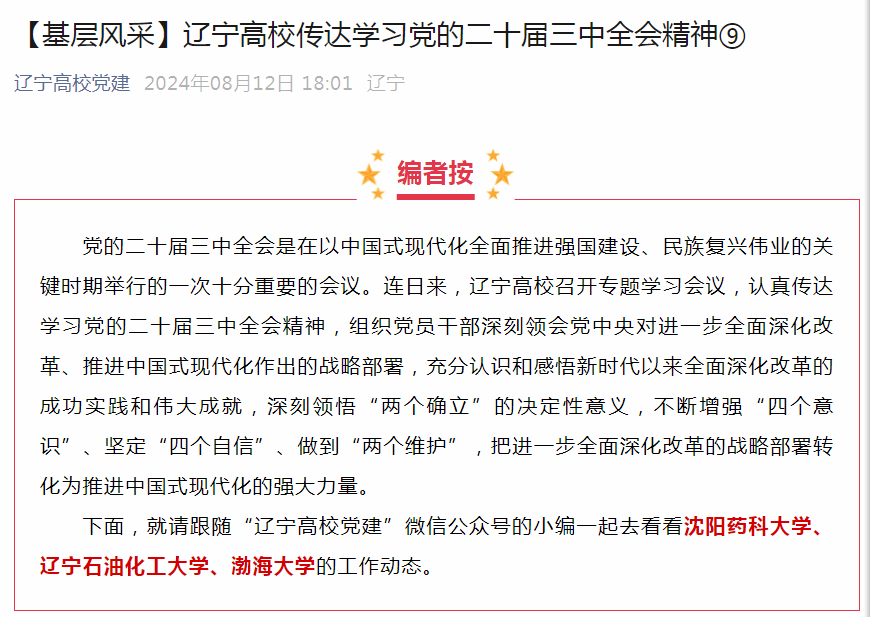 編者按:黨的二十屆三中全會是在以中國式現代化全面推進強國建設、民族復興偉業的關鍵時期舉行的一次十分重要的會議。連日來,遼寧高校召開專題學習會議,認真傳達學習黨的二十屆三中全會精神,8月12日,遼寧高校黨建微信公眾號對我校召開黨紀學習教育第八次集中學習暨2024年黨委理論學習中心組第十七次集體學習會議,組織黨員干部深刻領會黨中央對進一步全面深化改革、推進中國式現代化作出的戰略部署,充分認識和感悟新時代以來全面深化改革的成功實踐和偉大成就進行了宣傳報道。現將相關報道轉載如下: